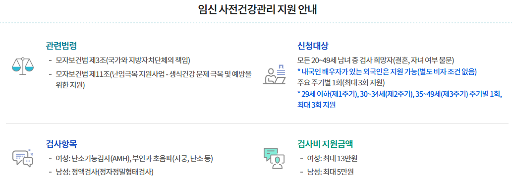 - 여성 : 난소기능검사(AMH), 부인과 초음파 검사로 최대 13만원 까지 지원
