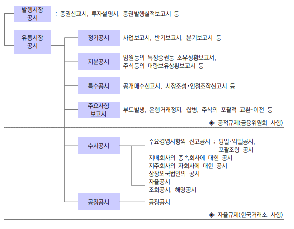 기업공시는 크게 발행시장과 유통시장으로 나뉜다. 발행시장은 신규상장을 위해 IPO를 하는경우에 진행하게되며 증권신고서, 투자설명서, 증권발행실적 보고서등을 공시하게 된다. 그리고 이제 우리가 종목을 공부하기 위해 알아야할 부분은 바로 유통시장의 공시이다. 말 그대로 유통시장은 현재 주식시장에서 유통이 되고있는 종목들에 대한 공시라고 보면된다. 여기에는 정기적으로 제출하는 사업보고서, 분기보고서, 반기보고서와 같은 정기공시가 있고, 주식의 소유/보유에 따른 지분공시사항 그리고 회사의 주요 경영활동에 대한 내용을 담고있는 주요사항보고서와 수시공시사항 그리고 마지막으로 기업이 미래의 사업계획이나 경영계획, 전망 또는 예측치를 투자자들에게 알리고 싶을때 진행하는 공정공시가 있다.