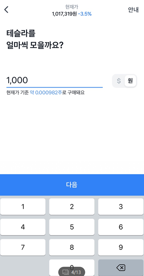 토스에서는 올해 4월부터 소수점거래가 오픈되었다. 해외주식중 우량주나 대형주들은 1주의 가격이 굉장히 비싼경우가 많은데 이젠 실시간으로 소수점단위의 거래가 가능하다. 최소 1,000원부터 가능하기 때문에 단돈 천원으로도 테슬라 주식투자도 가능하다는 점! 거래 수수료도 일반적으로 주식매매를 할때와 동일한 수수료가 적용되기 때문에 추가 수수료의 부담도 없다.