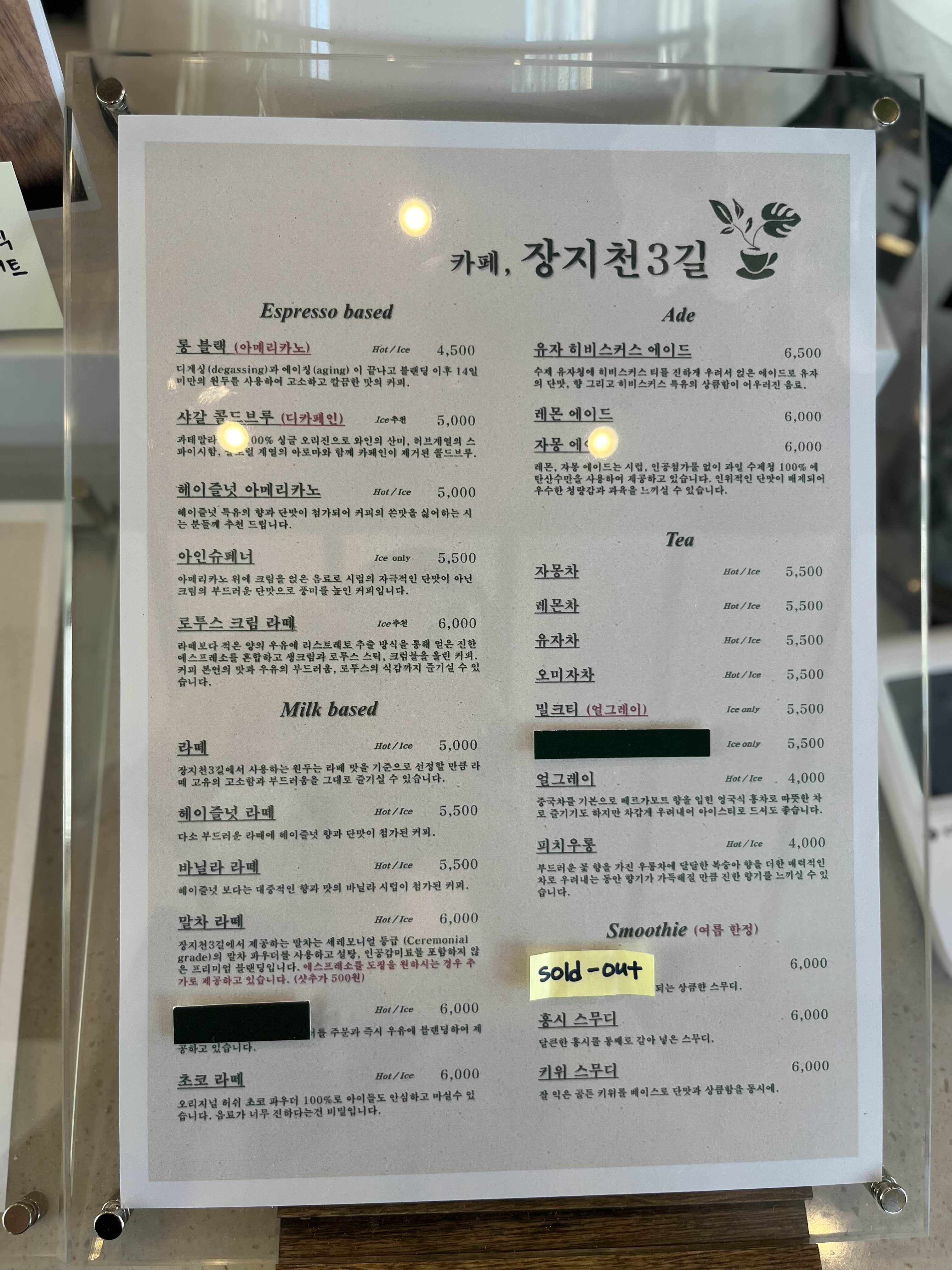 장지천3길을 좋아하는 이유중 하나! 바로 메뉴중 디카페인이 있기 때문이다. 그외에도 에에드, 차, 스무디등도 판매 중!