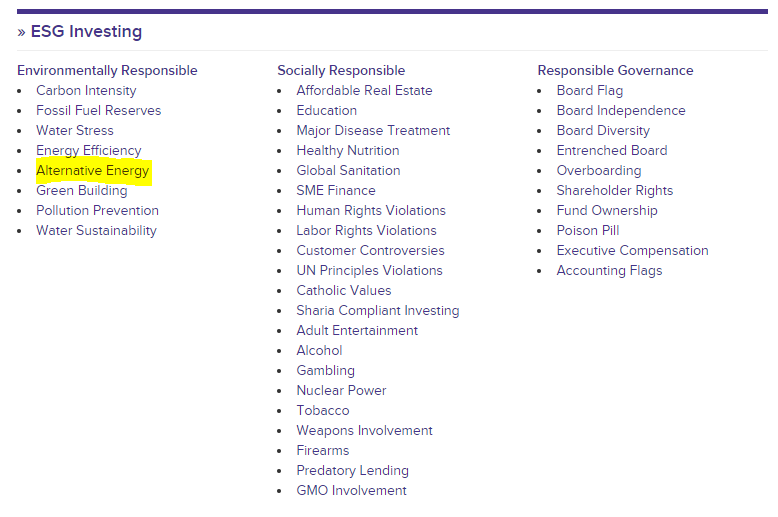 오늘은 위 리스트중 환경에 속하면서도 '대체 에너지(Alternative Energy)'관련 ETF들을 몇가지 간단하게 정리해 보려고 한다. 참고로 미국기반의 ETF들만 리스트업이 되어있는 자료이다.