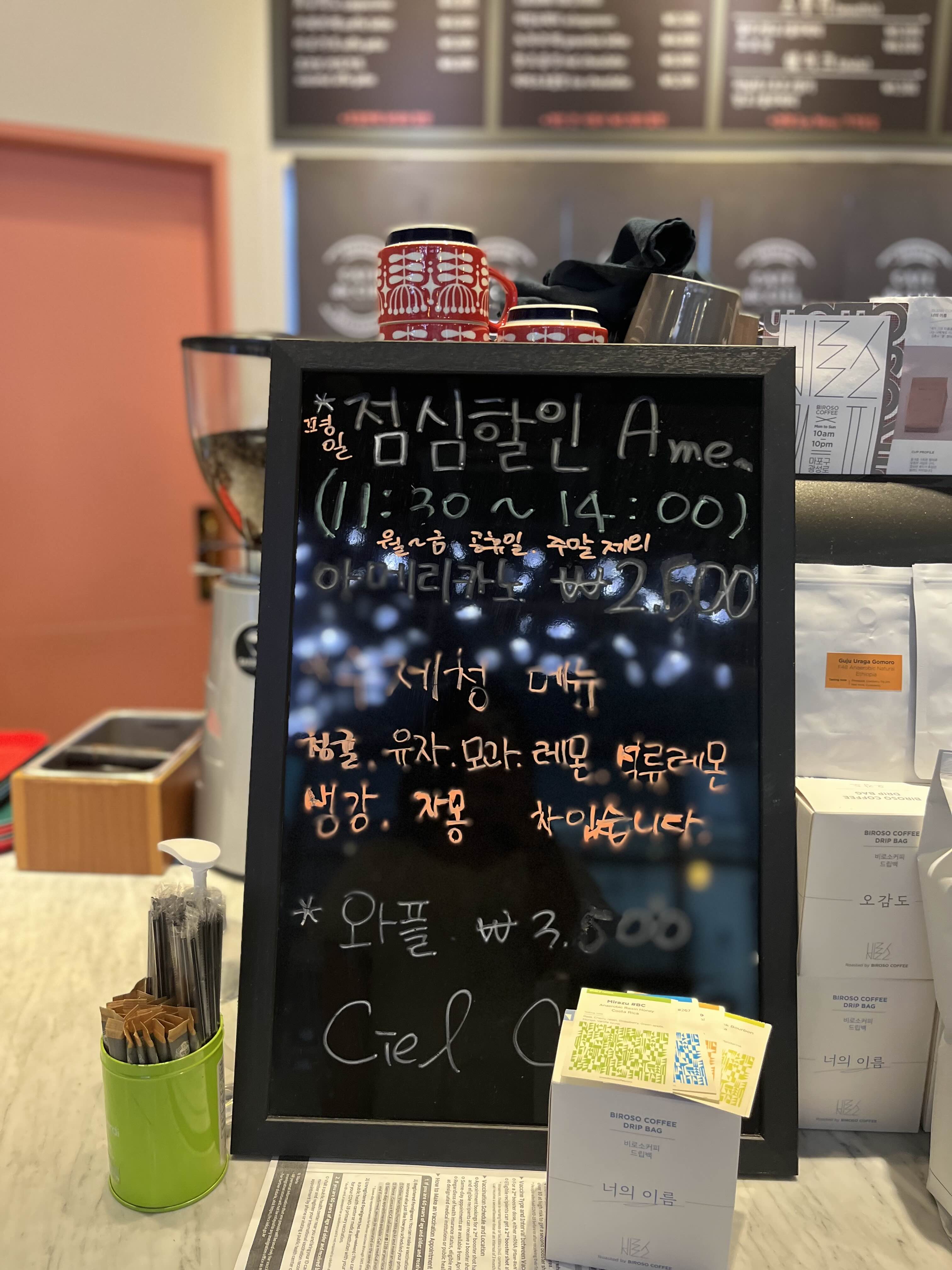 평일같은 경우에는 점심에 아메리카노도 2,500원으로 할인중이니 가격도 괜찮은편이다. 물론 나는 주말에 갔기 때문에 할인은 받지 못했지만 요즘 대부분 아메리카노가 4천원이 넘기 때문에 카페드씨엘은 가격대나 비싼편은 아니라고 느껴졌다.