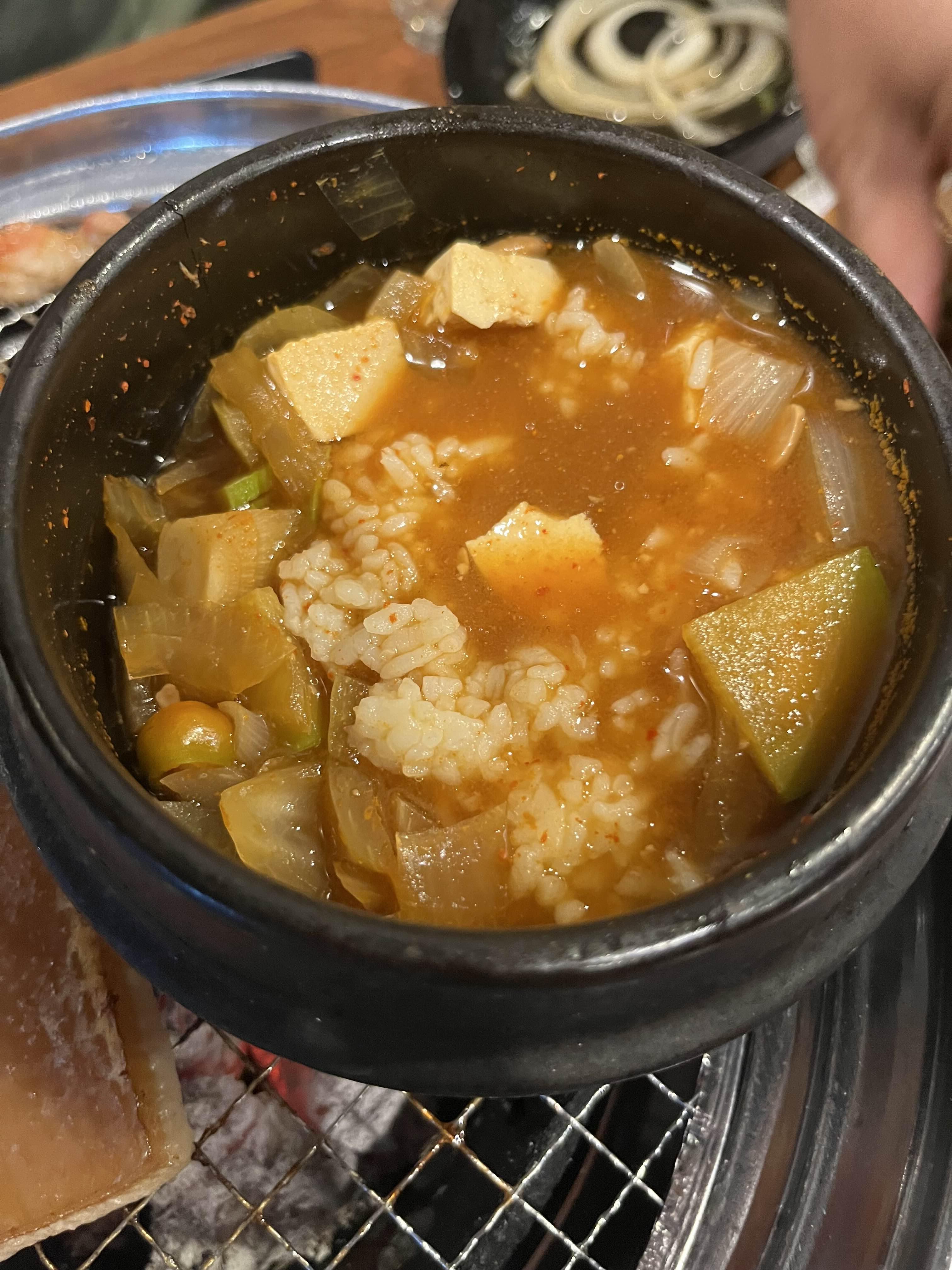 저녁식사겸 방문을 했어서 공기밥과 된장찌개도 주문했다. 3천원 이지만 맛은 정말 고퀄리티에 진국..! 집된장 혹은 할머니 된장으로 끓인듯한 깊은맛이 나는 된장이고 굉장히 매콤한 스타일이다. 고기먹다 느끼해질때 쯤 요 된장찌개 한수저 뜨면 느낌함 싹내려가는 개운한 맛! 찌개 좋아하시면 꼭꼭 주문해아하는 메뉴다.