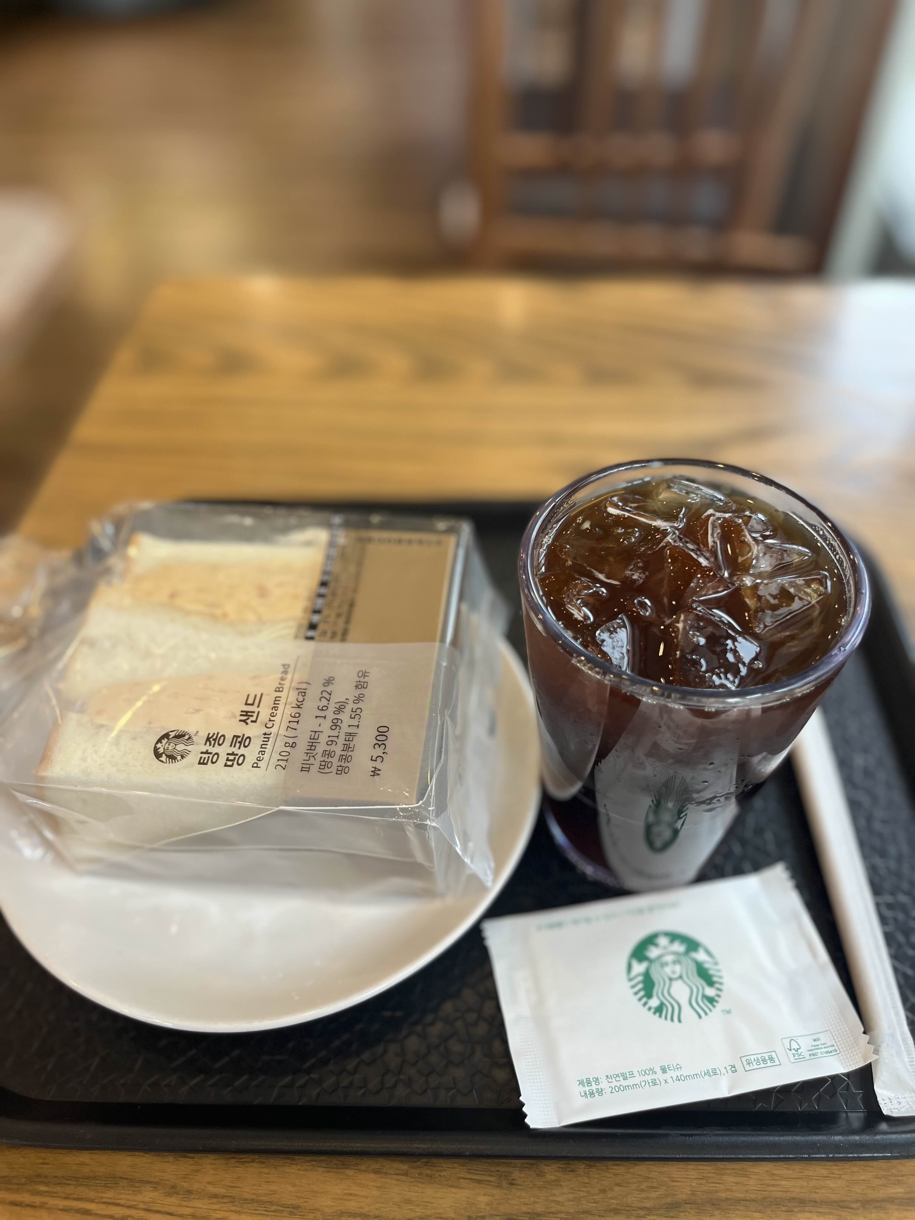 사이렌 오더를 통해 탕종땅콩샌드와 디카페인 아메리카노 주문..! 생각보다 칼로리가 꽤나 높다는 생각이 들긴 했는데 사이즈가 크고 양이 많은편이여서 반씩 나눠먹으면 딱 좋을 사이즈 이긴 했다.