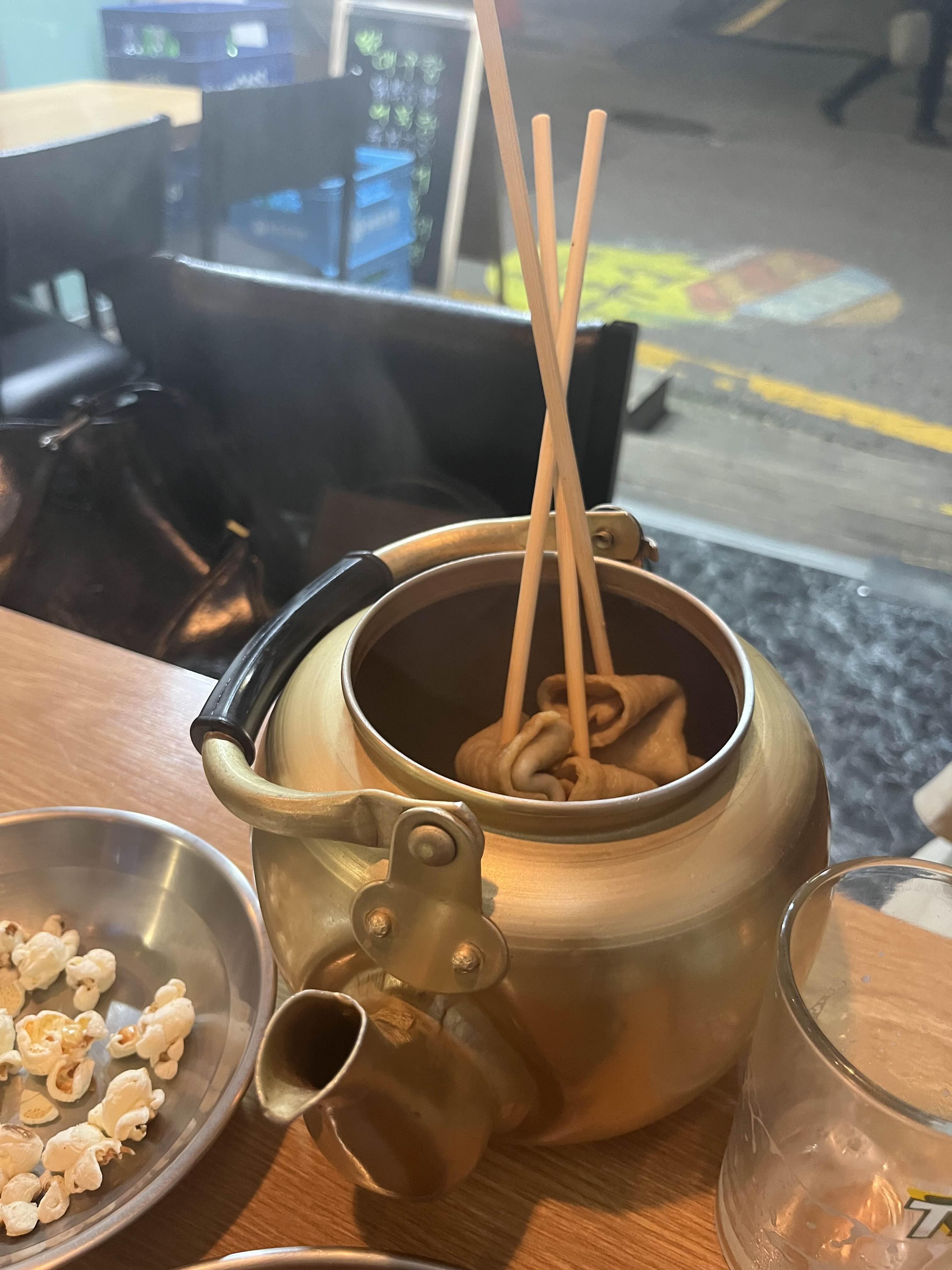 먹고있는데 갑자기 서비스라며 내어주신 주전자 꼬치어묵! 원래 정식메뉴로 있는거고 아마 따로 주문하면 어묵6꼬치인가? 줬던것 같은데 3명이서 왔떠니 꼬치3개를 주셨다. 주전자에 나와서 꼬치어묵 먹고 종이컵에 국물 떠먹으면 아주 굿..! 이것 역시 굉장히 칼칼해서 맵찔이는 살짝 주의해야함!