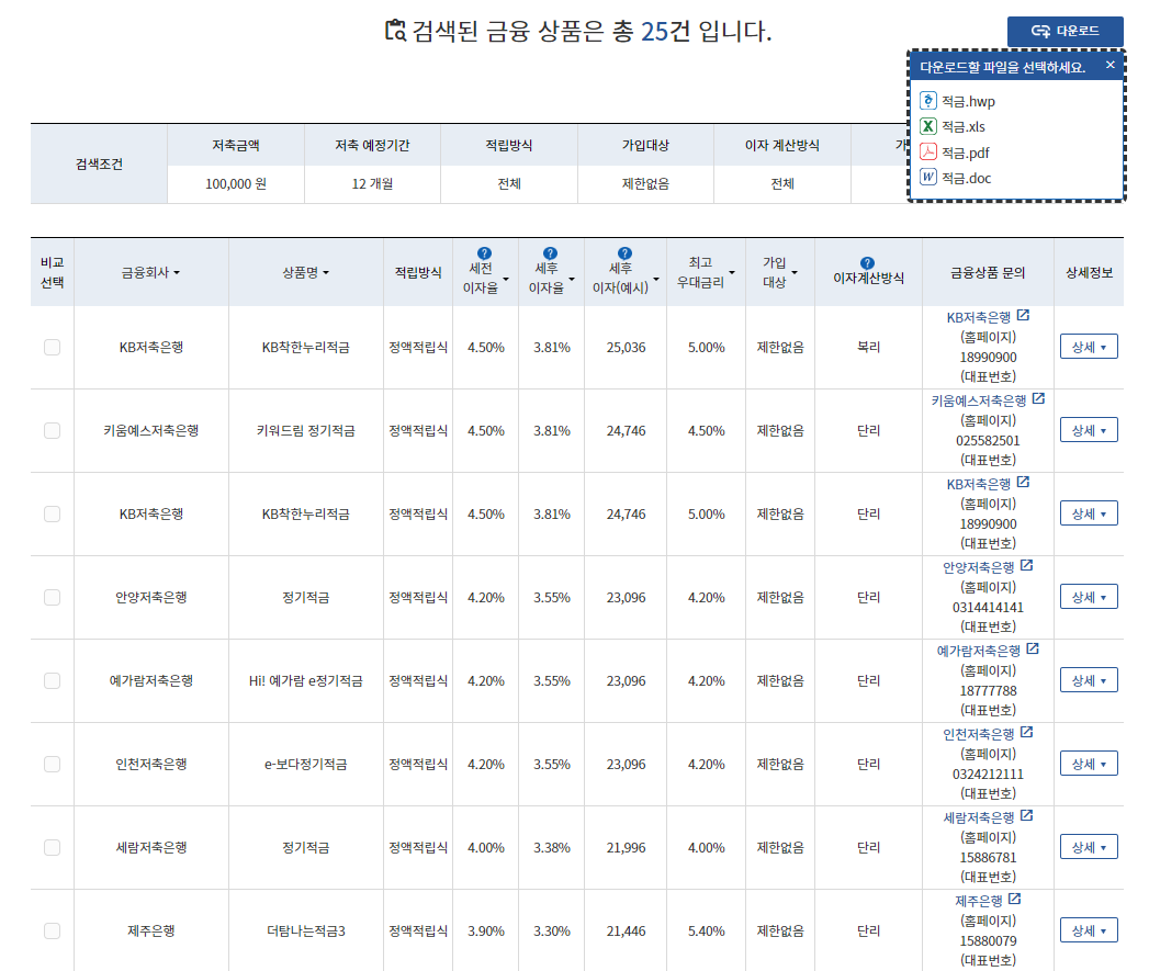 또한 금융상품을 검색한 다음 오른쪽 상단에 '다운로드'를 눌러서 문서화 한 후 한눈에 보고 비교도 가능하다. 금융감독원에서 제공하다보니 데이터의 신뢰성도 높은편이라고 할 수 있겠다.