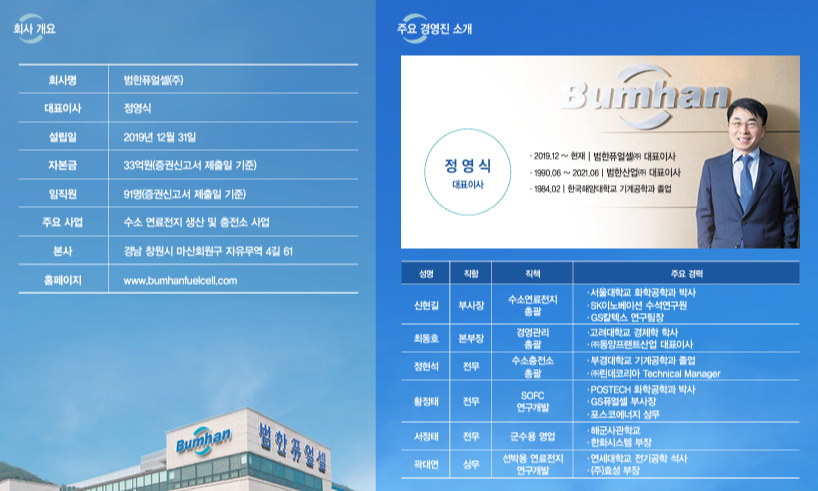 범한퓨얼셀은 2019년 범한산업의 수소연료전지 사업부가 물전분할해 설립된 수소연료전지와 수소 충전소사업을 영위하는 회사로 잠수함용과 건물용 연료전지에 특화된 기술을 보유하고 있는 회사이다. 수소가 미래에너지로 곽광받고있다는 이야기는 누구나 한번쯤 들어봤기 때문에 더욱 눈길이 갔던 곳! 2021년기준 잠수함용 연료전지 매출이 약 46.4%, 수소충전소 매출이 38.6% 그리고 건물용 연료전지 매출이 11.3%로 수소관련 사업 포트폴리오를 계속해서 확장해 나갈 예정이라고 한다.