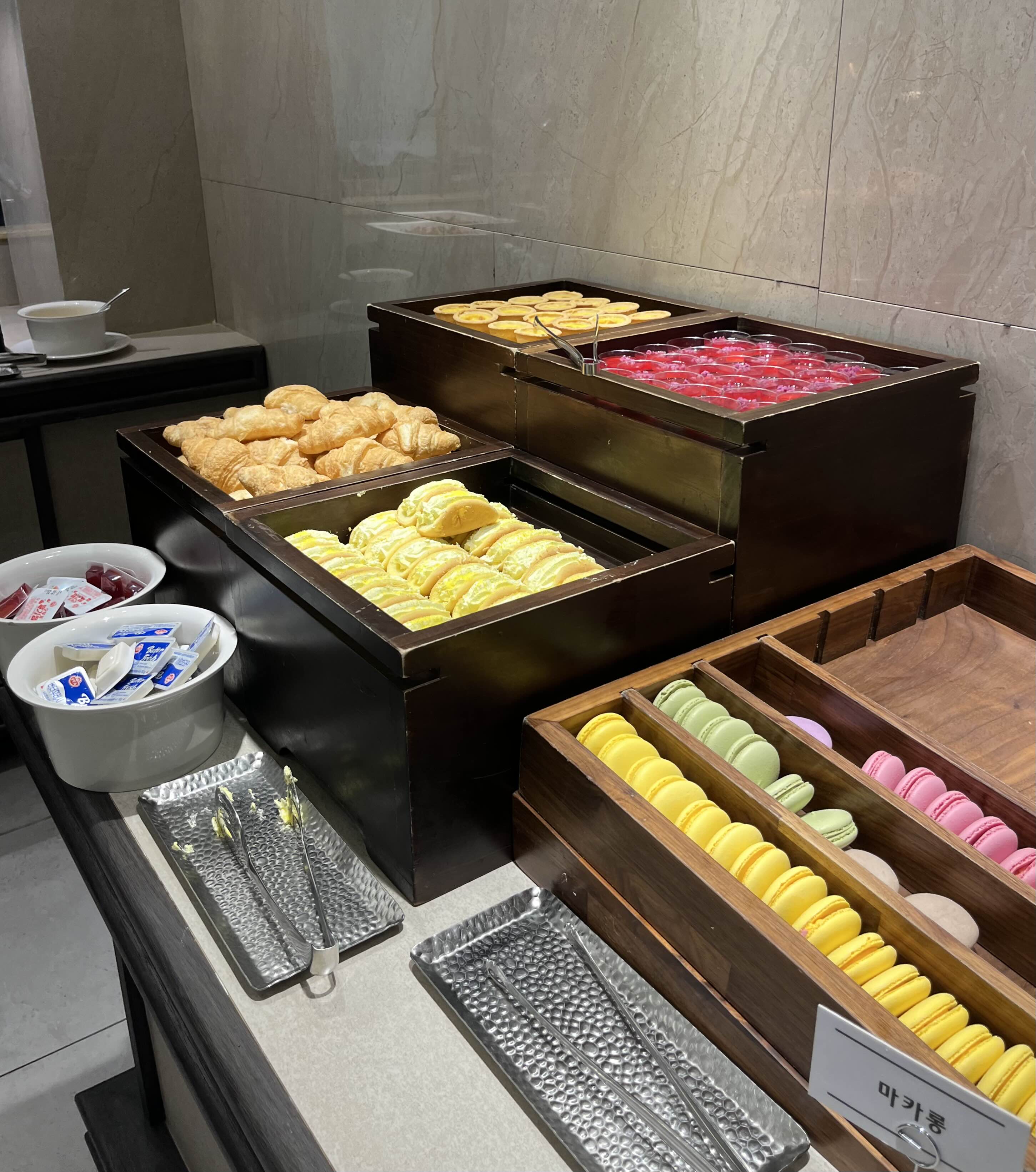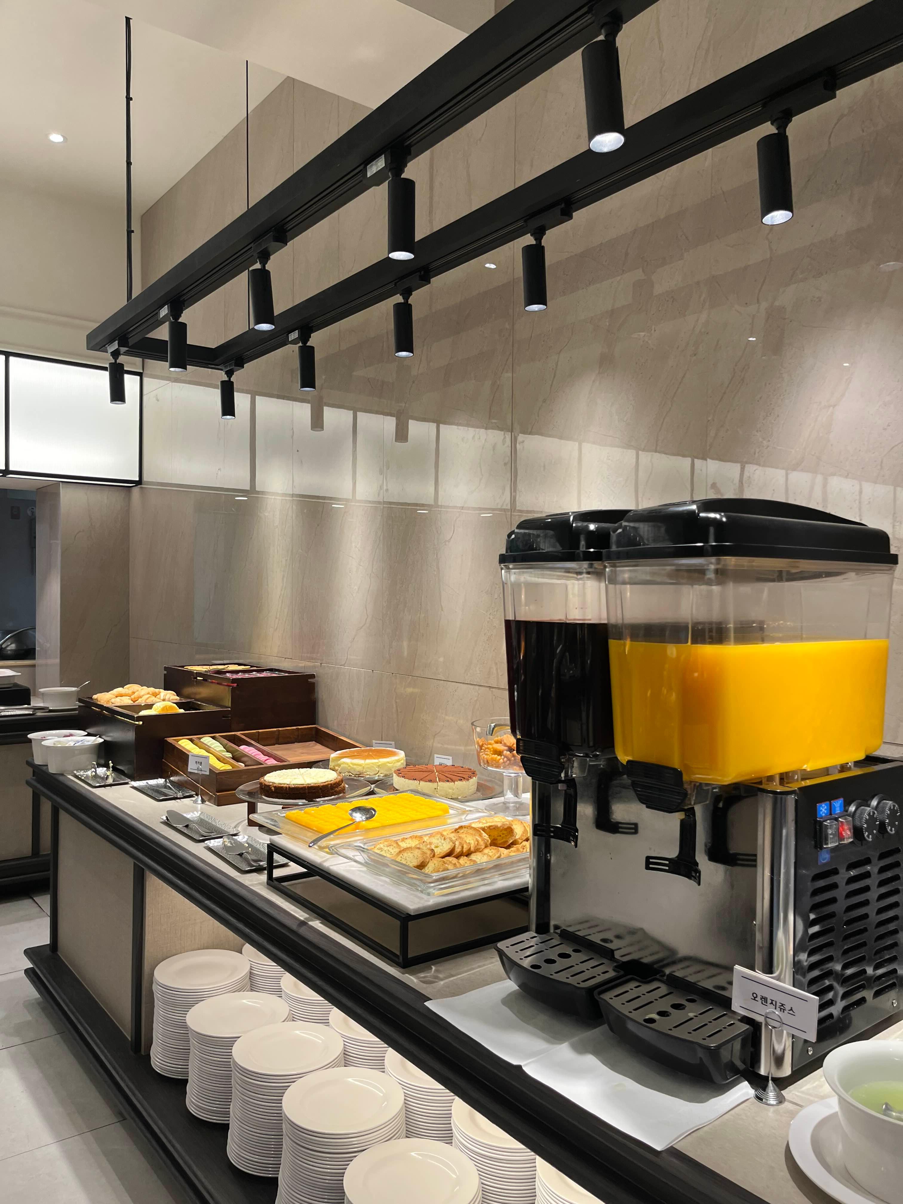 주스 종류는 총 2가지 준비되어 있었고 디저트류는 케이크 3종류, 미니약과, 바게트빵, 마카롱, 슈, 크로와상, 오믈렛 등등 있었는데 아주 퀄리티가 좋지는 않고 그냥 웨딩홀에서 나오는 수준이였어요!