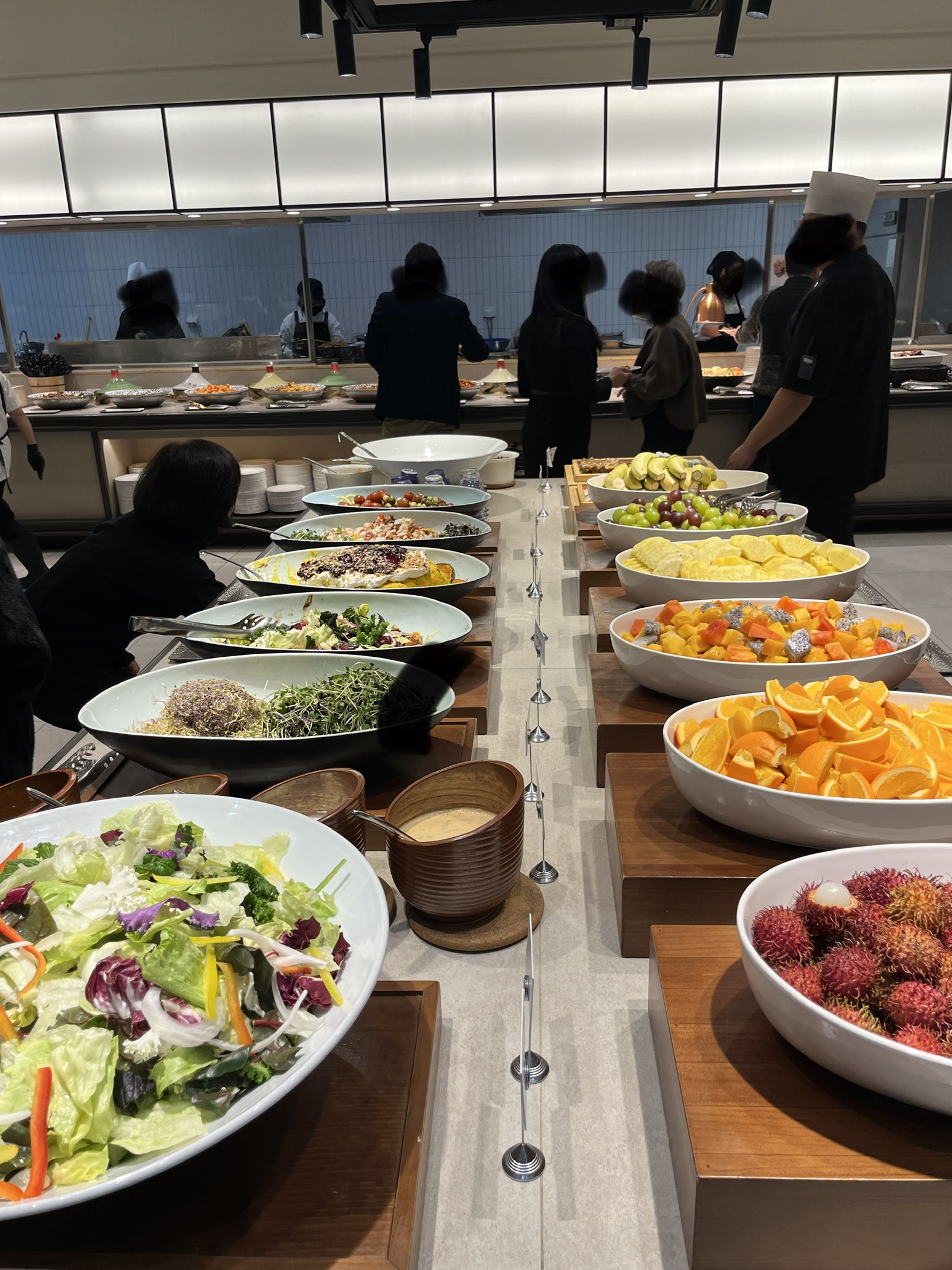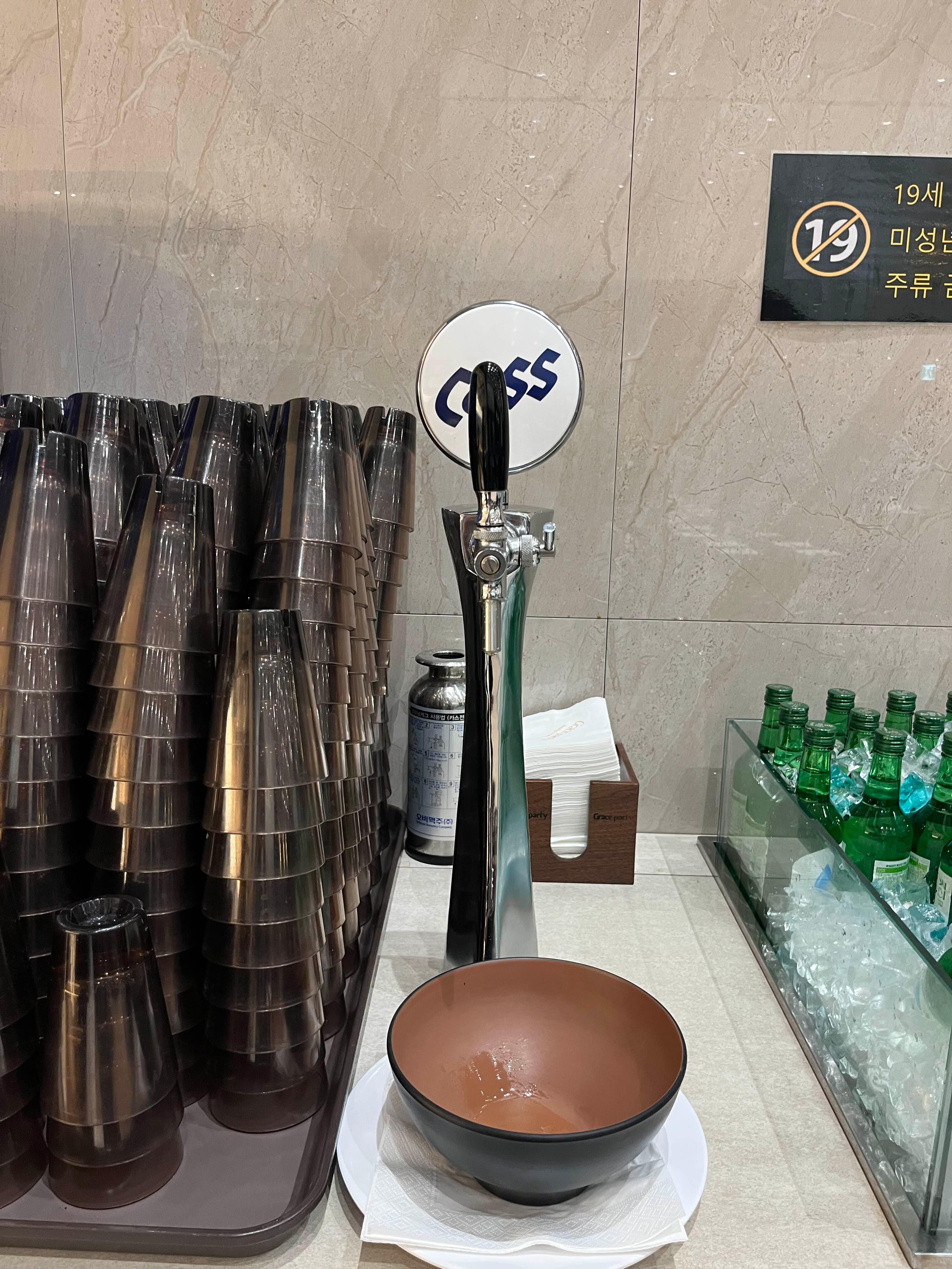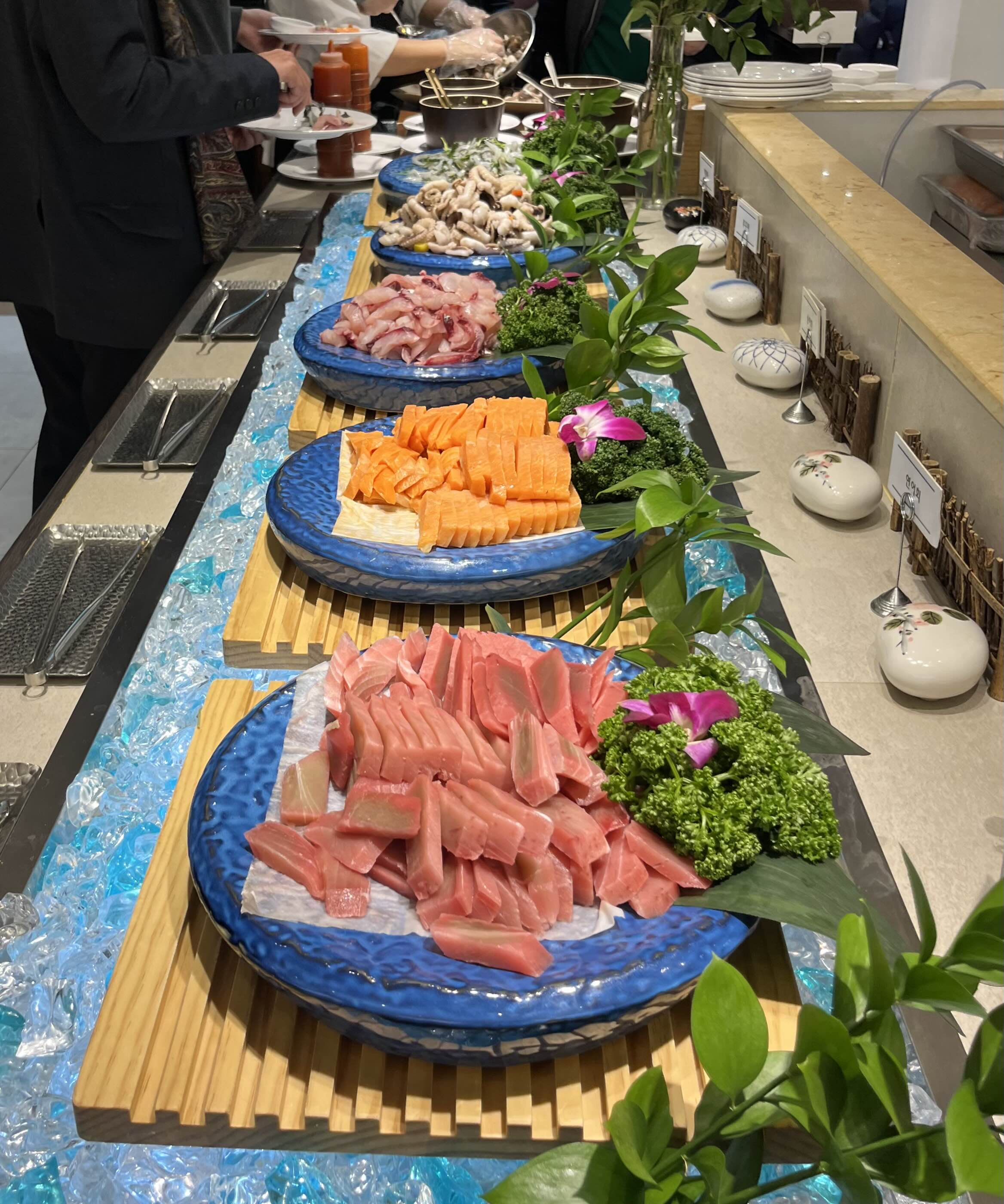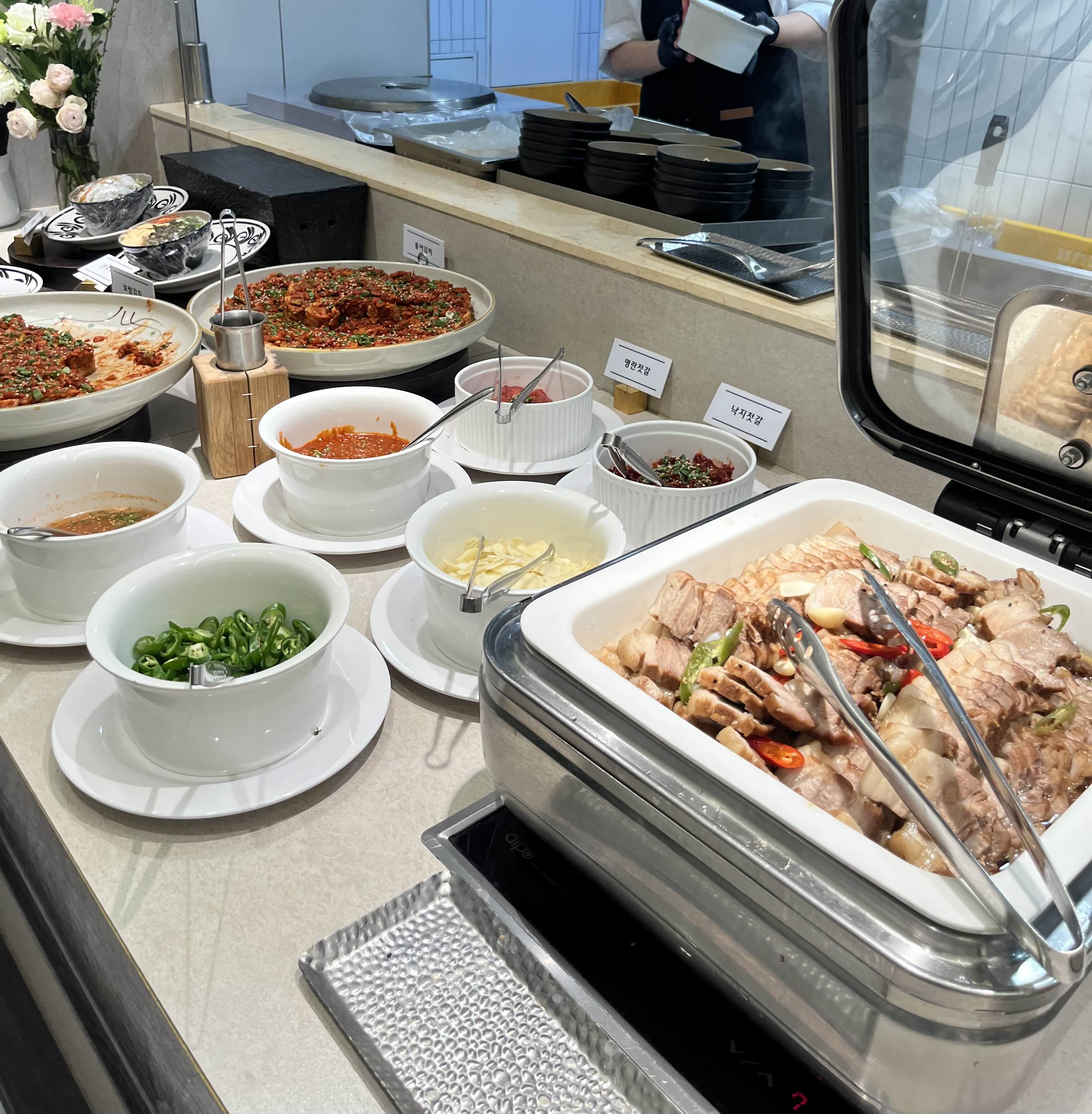 큰 연회장에 테이블이 한쪽에 쫙 놓여있는데 음식 담는곳과 먼 자리는 조금 너무 멀긴 하더라구요...안쪽에 앉은 손님은 왔다갔다하기 쵸큼 힘들것 같았습니다. 연회장은 특별히 고급스럽거나 화려한 느낌은 아니고 조금 평범한 느낌이였어요.