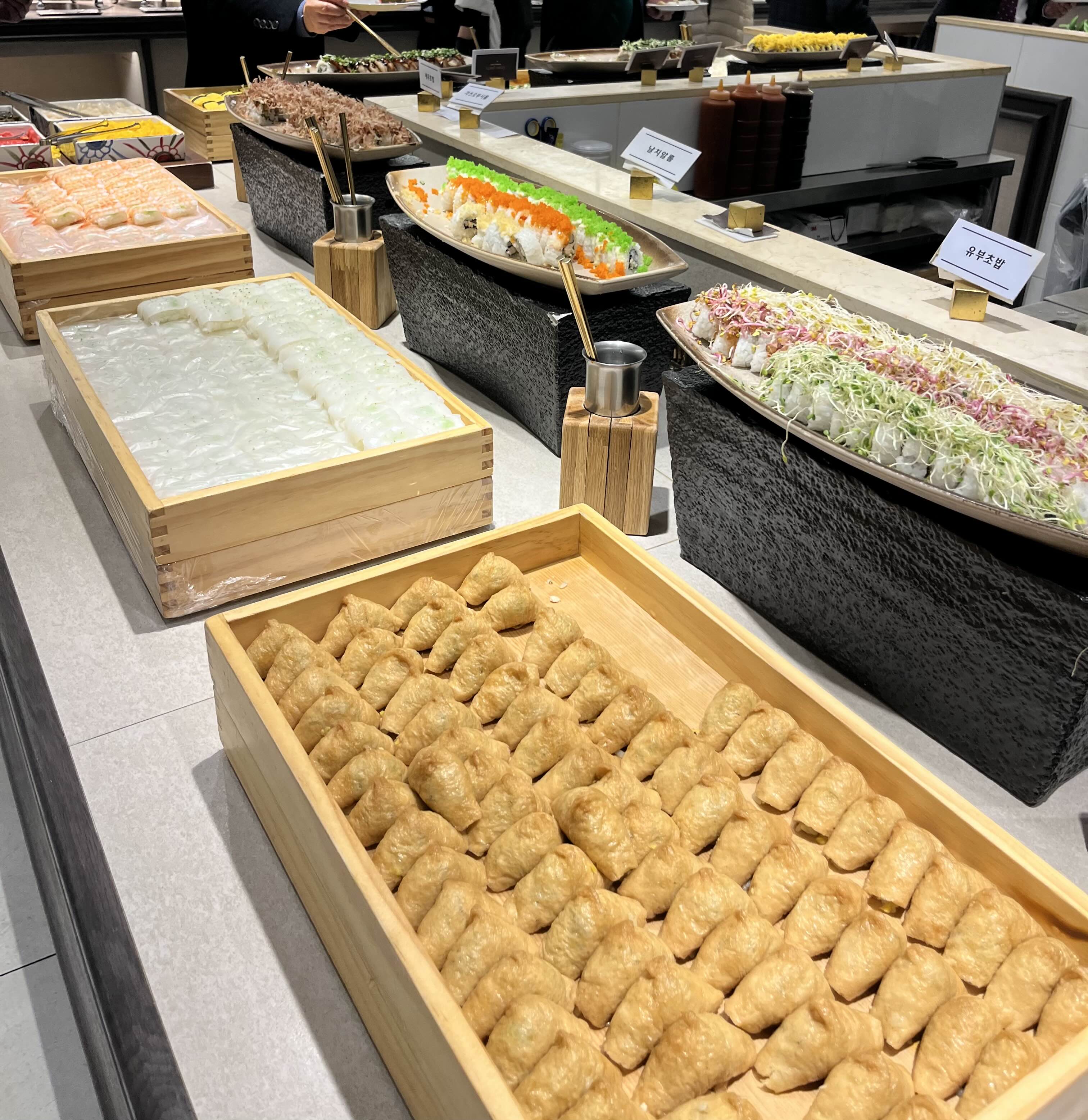 달걀초밥, 유부초밥, 새우초밥, 광어초밥과 스시롤은 한 5가지 종류가 있었습니다. 맛도 전반적으로 나쁘지 않았고 신선도도 괜찮았어요.