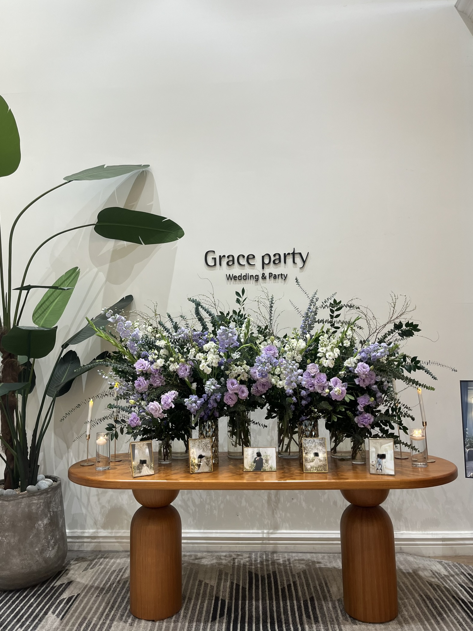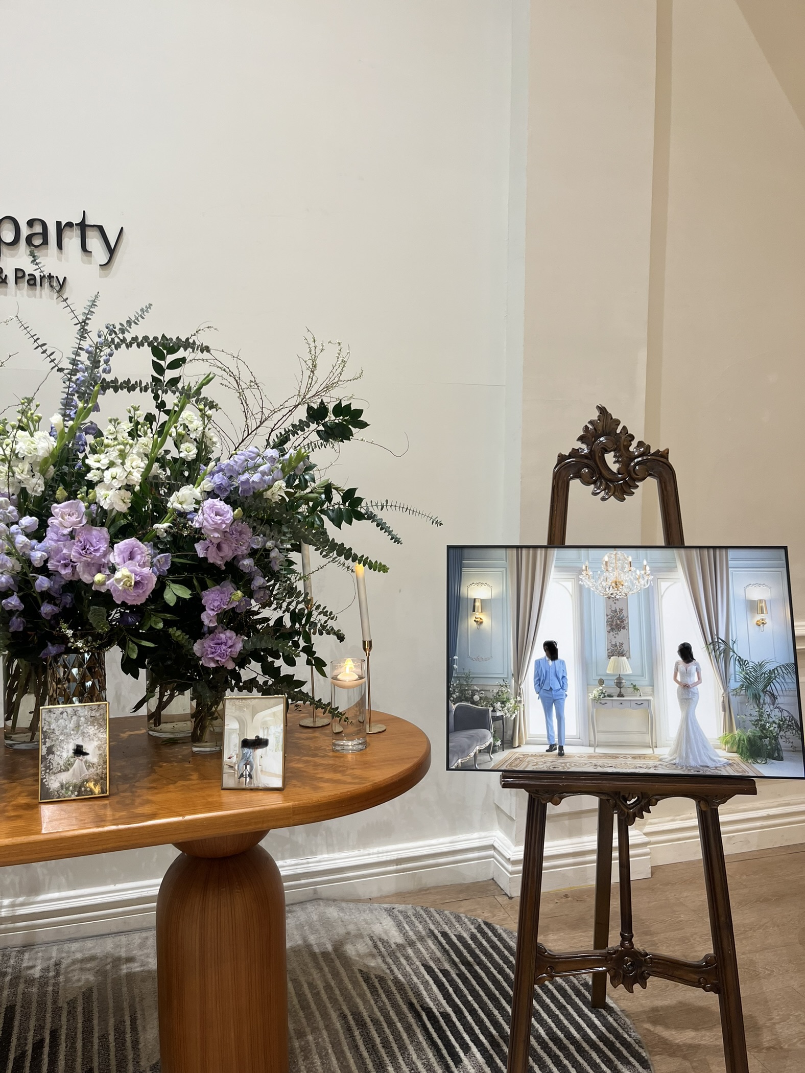 작은액자 5개와 큰 액자 1개가 놓여있었는데 보라보라한 꽃장식과 우드 테이블이 고급스럽더라구요. 전반적으로 분위기가 화사하면서도 차분했습니다.
