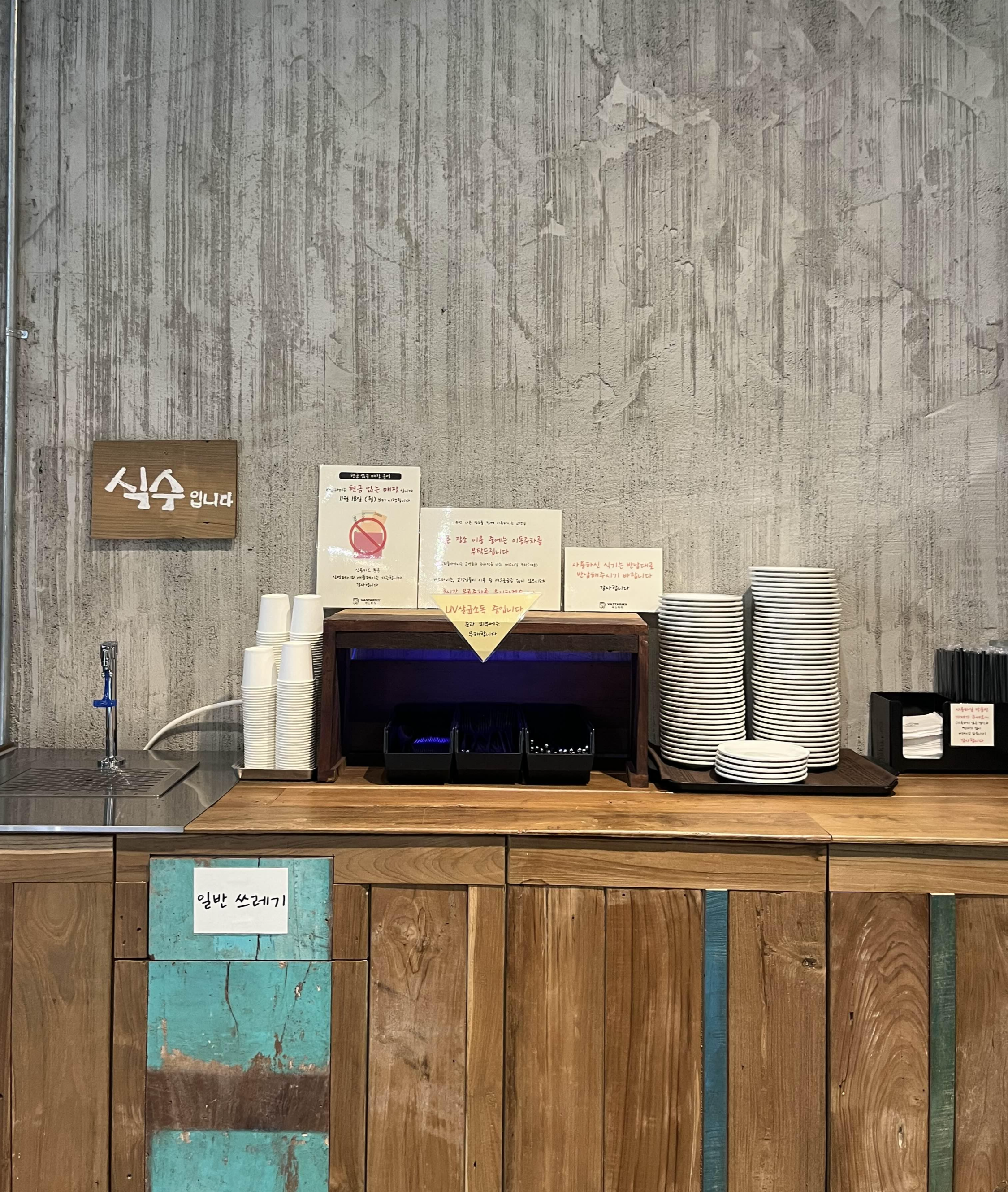 한켠에는 식수대와 커트러리를 이용할 수 있는 셀프바도 준비되어 있습니다.