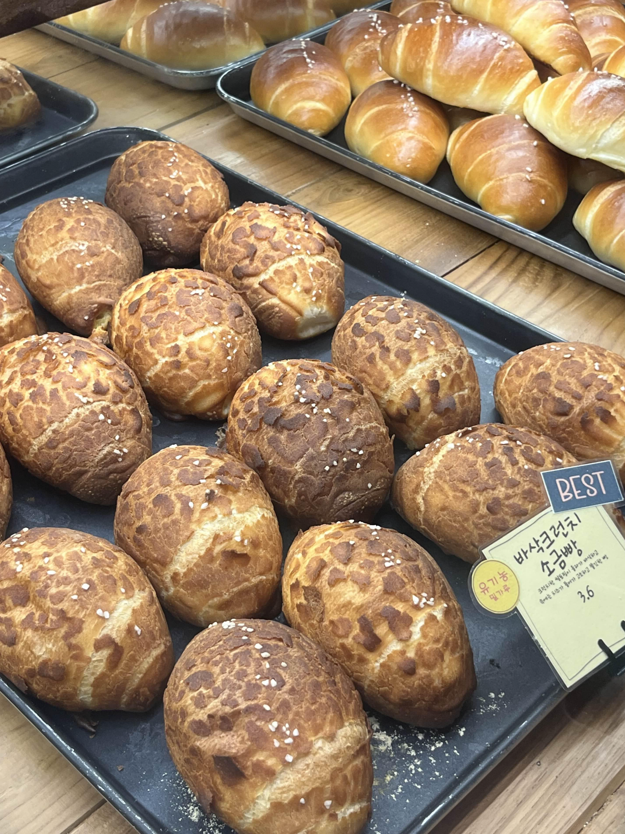 그리고 이제는 빠지면 아쉬운 소금빵까지 세 종류나 있더라구요. 근데 여기 기본소금빵이 반질반질하니 넘나 맛있어보여서 보자마자 집어버렸습니다 ㅋㅋ