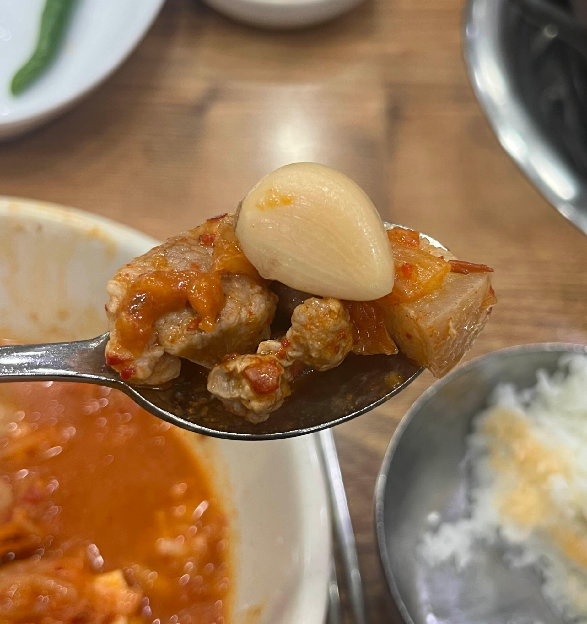 고추와 쌈장, 마늘장아찌, 무말랭이를 주시는데 국밥집이랑 비슷하지만 메뉴가 김치찌개이다보니 김치는 따로 안나오더라구요. 무말랭이와 마늘 장아찌는 투박한 듯 할머니가 생각나는 반찬이였습니다.